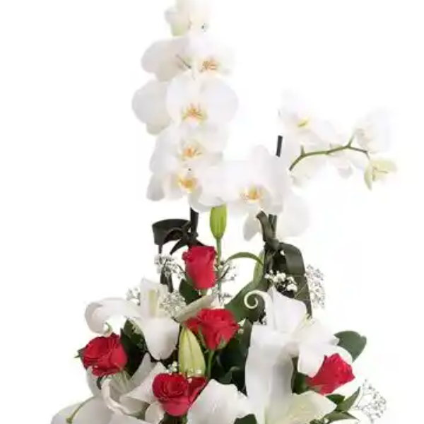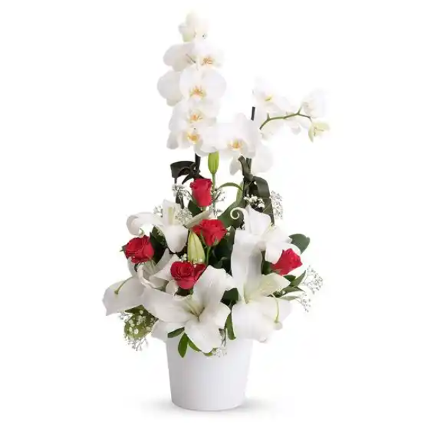 Ürün Kodu: Arm782 Dallı Beyaz Saksı Orkide Seramik Yanına 3 dal Lilyum 5 Adet Kırmızı Güller ve yeşillikler ile hazırlanmıştır... armeriacicek.com ile sevdiklerinize
