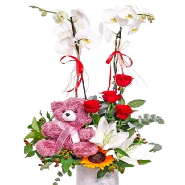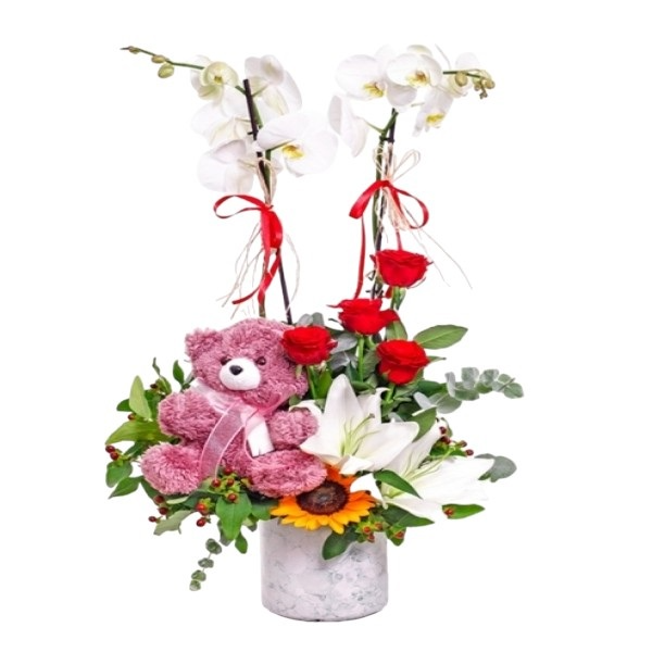 Ürün Kodu: Arm33Seramik Vazoda 2 Dallı Beyaz Orkide Saksı :Çiçeği ve 4 Adet Gül Ayıcık 25 cm 1 Dal Beyaz Lilyum ve Ayçiçeği Aranjman armeriacicek.com ile Sevdiklerinize