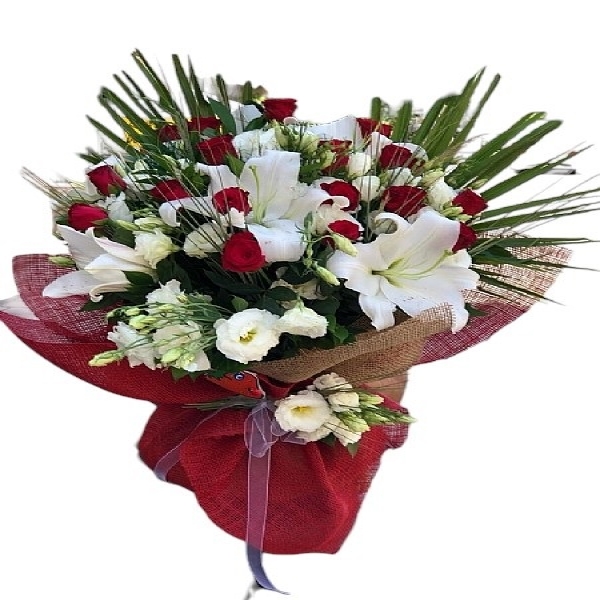 Ürün Kodu: Arm16519 Adet Kırmızı Gül 5 Dal Lilyum 11 Dal Lisyantus ve Yeşillikler ile Hazırlanmıştır.. armeriacicek.com kemerçiçek ile sevdiklerinize en güzel taze çiçekler
